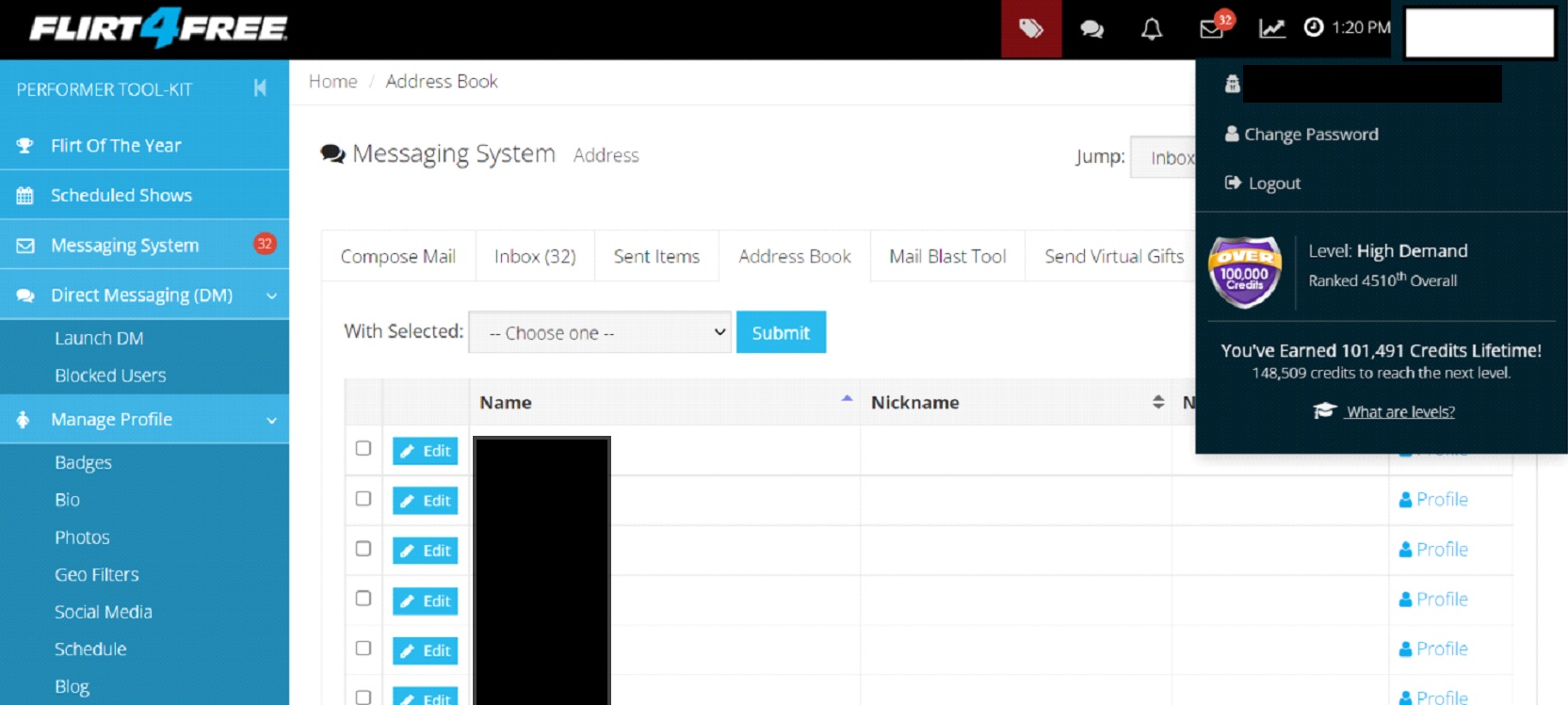 Как только вы зайдёте в личный кабинет Flirt4Free, увидите